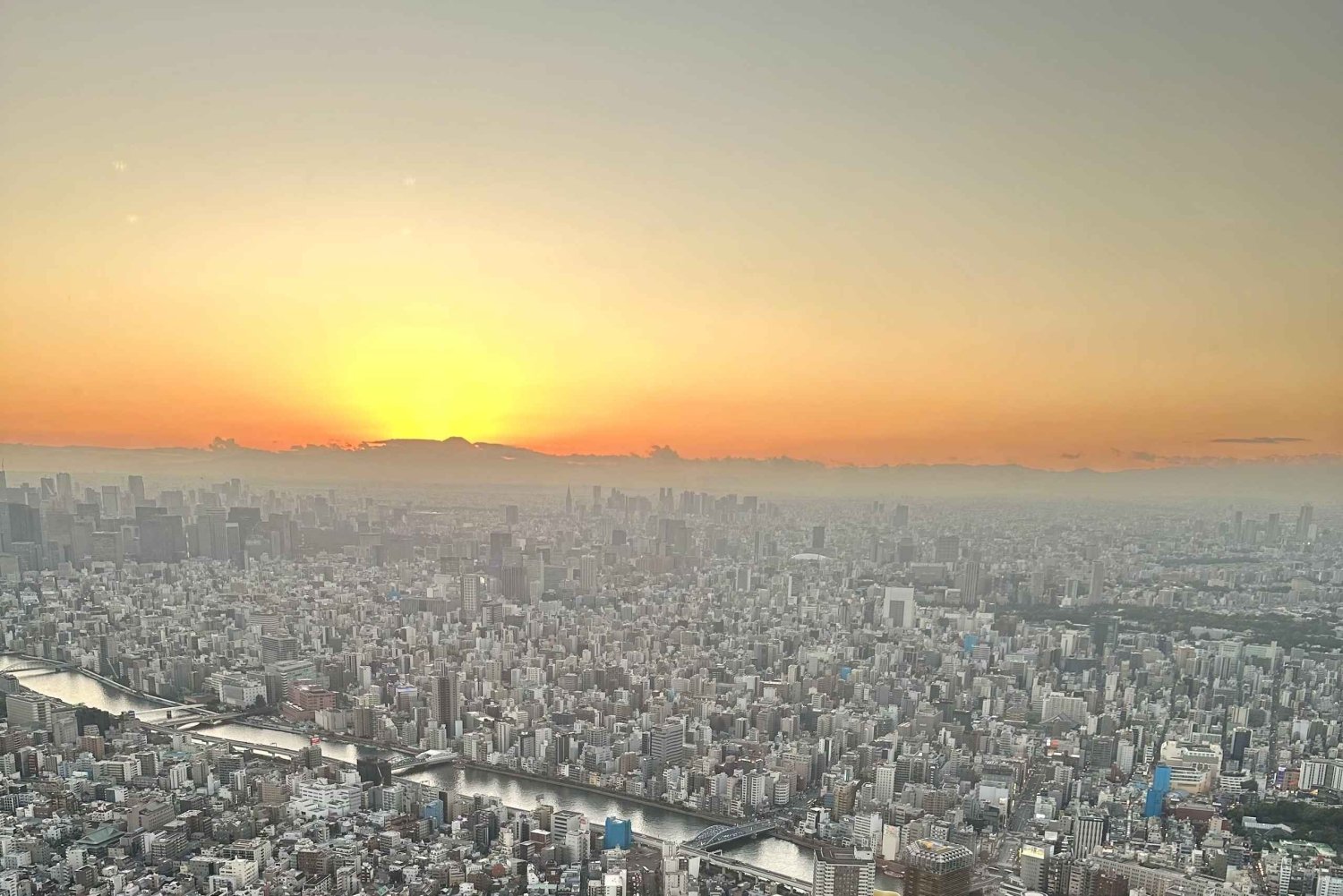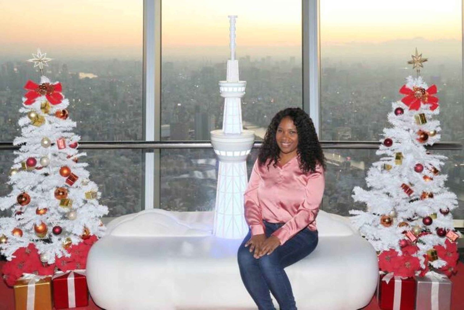 Lige efter ankomsten til Skytree klatrer vi op til begge observationsdæk: først til det nederste med en højde på 350 meter og derefter til det øverste med en højde på 450 meter.