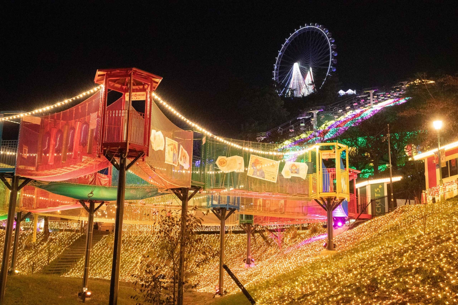 Når aftenen nærmer sig, fortsætter turen til sit natlige højdepunkt: Mori Mori Resort (Sagamiko Illumillion). Her lyser over 6 millioner LED'er bjergsiden op i levende farver. Gå gennem temazoner, der hver især byder på fantasifulde lysinstallationer og medrivende tunneler. Efter kl. 16.00 kan du gratis tage med Rainbow Lift – en svævebane, der lader dig svæve over det lysende landskab. For ekstra sjov kan du prøve valgfrie BETALTE aktiviteter såsom rutsjebanen Magical Wave og Tamagotchi Hoshizora Pedal sky bike. Hvis du er sulten, kan du på stedet i Wild Dining food court få lækre favoritter som tonkatsu, hamburgersteak og ramen.