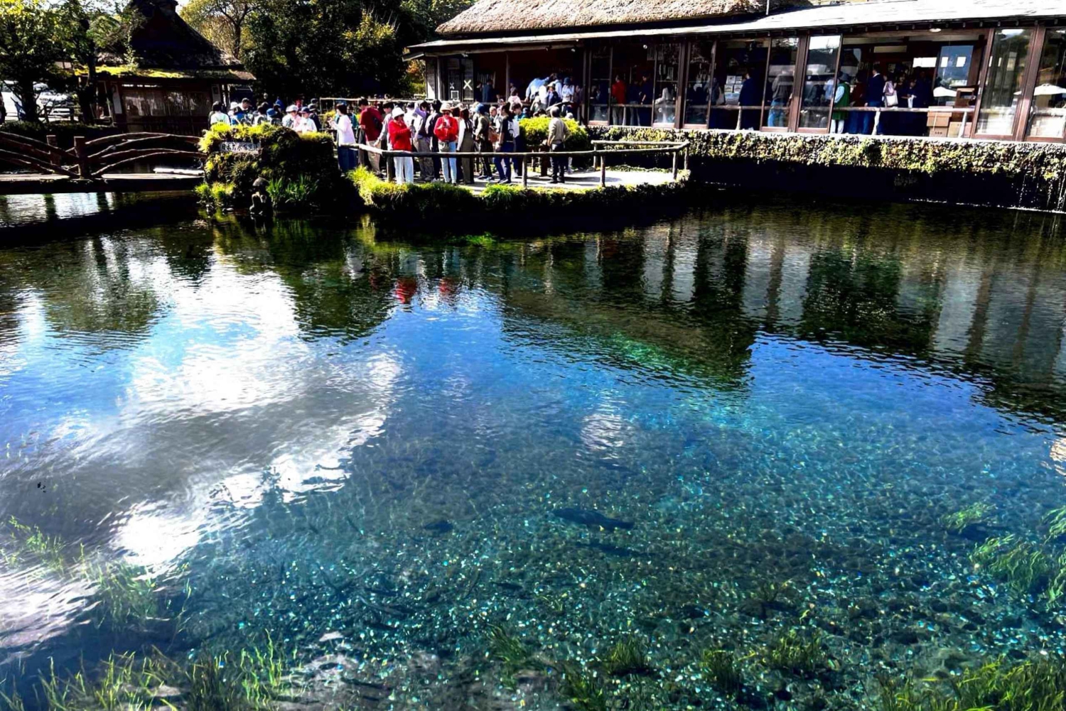 Setz deine Reise nach Oshino Hakkai fort, einem ruhigen, traditionellen Dorf, das für seine acht unberührten, von Quellen gespeisten Teiche, seine malerischen Holzbrücken und die atemberaubende Aussicht auf den Berg bekannt ist. Fuji spiegelt sich im Wasser. Das ist ein toller Ort für gemütliche Spaziergänge, Fotos und lokale Snacks.