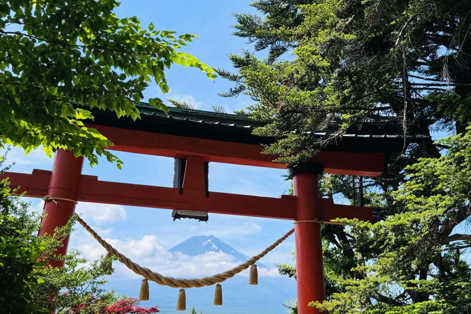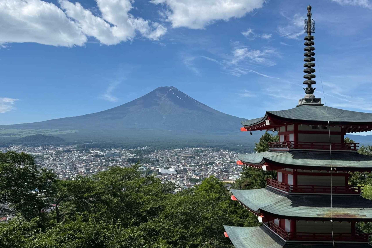 Beginne deinen Tag mit einer bequemen Abholung von deinem Hotel in Tokio mit einem GREEN PLATE Fahrzeug. Fahr in einem privaten, klimatisierten Fahrzeug direkt zum Berg. Dein erster Halt ist die atemberaubende Chureito-Pagode, einer der meistfotografierten Orte Japans, der einen postkartenwürdigen Blick auf den Fuji bietet. Fuji hinter der ikonischen fünfstöckigen Pagode.