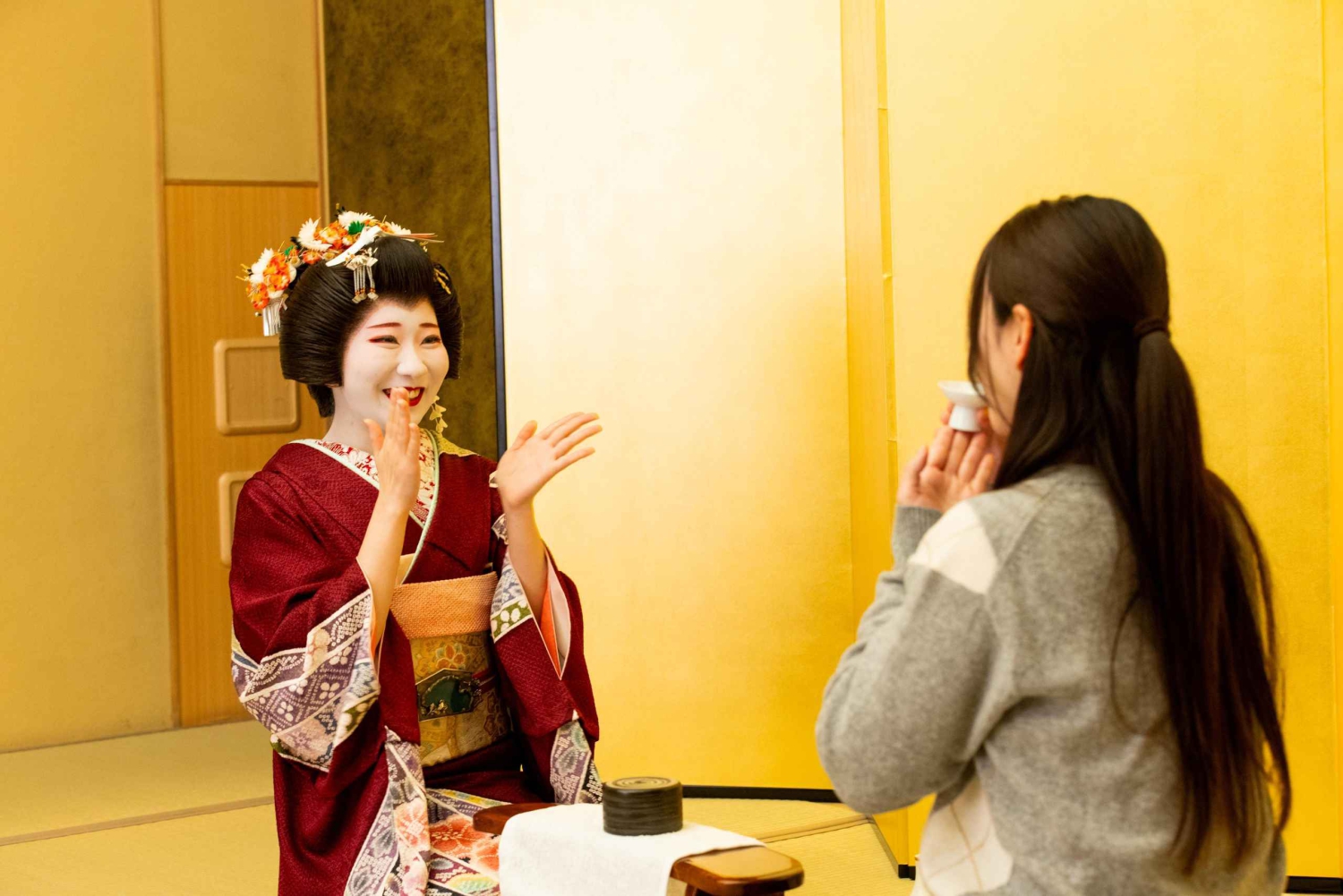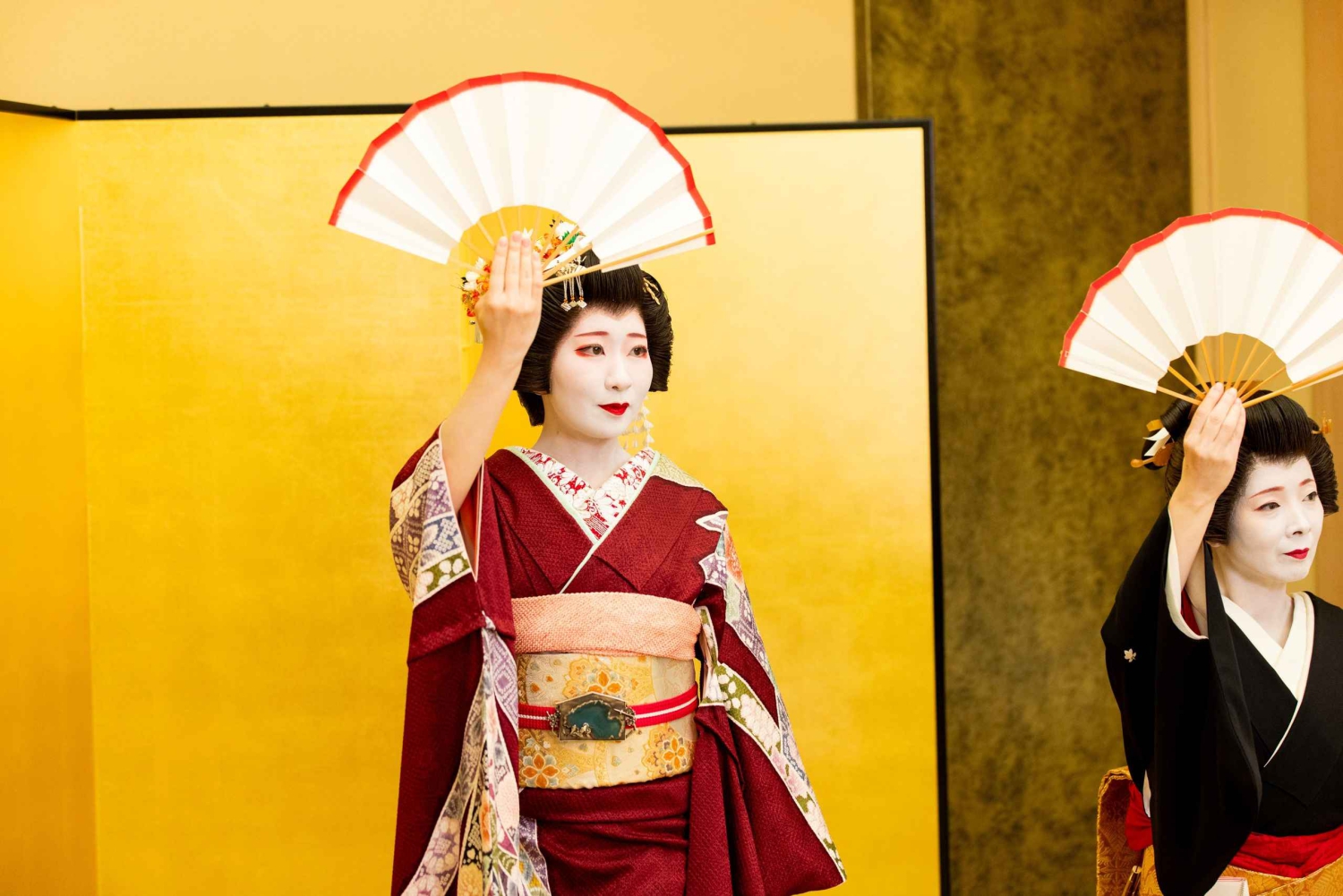 Experiencia cultural de 75 minutos con encuentro con geishas reales, espectáculo de danza, música shamisen en directo, juego ozashiki-asobi, dulces japoneses de temporada, matcha recién batido y foto conmemorativa con las geishas.