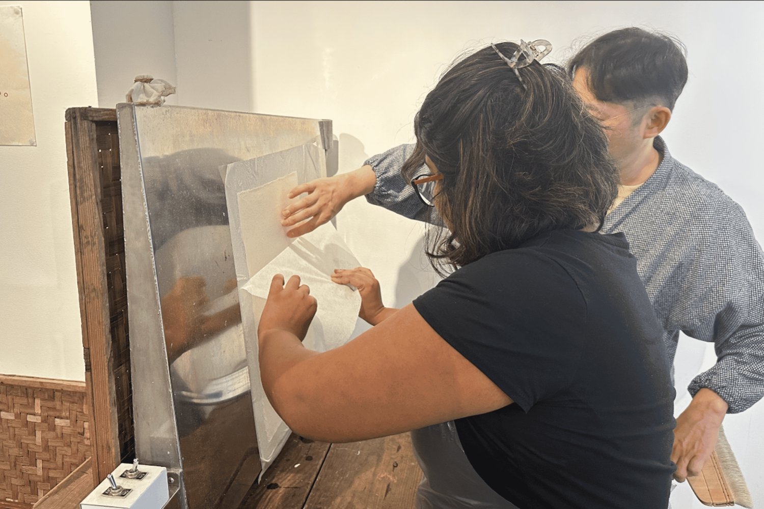 Käsityöläiset kaatavat vettä washi-paperin päälle, luovat erilaisia kuvioita ja värjäävät sen jälkeen sen luodakseen kaunista ja herkkää washi-paperia nimeltä 'Rakusuishi'.