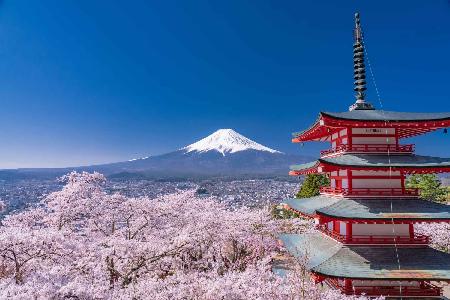 Kevät: Puistossa kukkii 650 kirsikkapuuta, ja viisikerroksinen pagodi ja Fuji-vuori taustalla luovat postikorttimaisen unenomaisen näkymän.