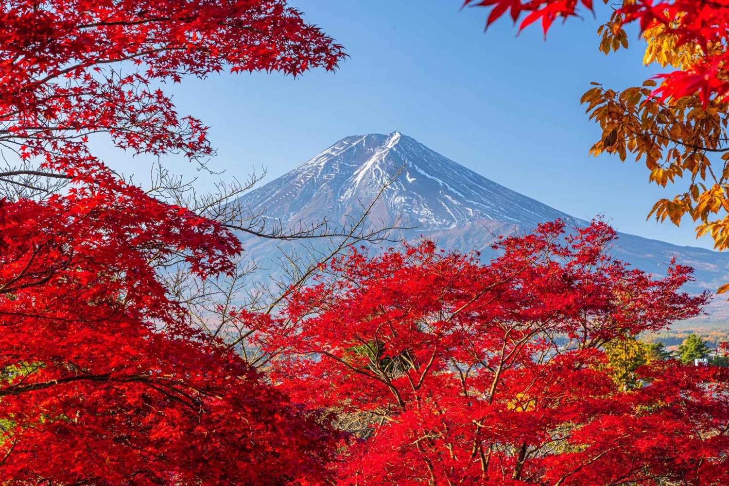 Syksy: Keltaiset ja punaiset lehdet täydentävät katukuvaa, ja Fuji-vuoren ensimmäinen lumi näkyy hämärästi.