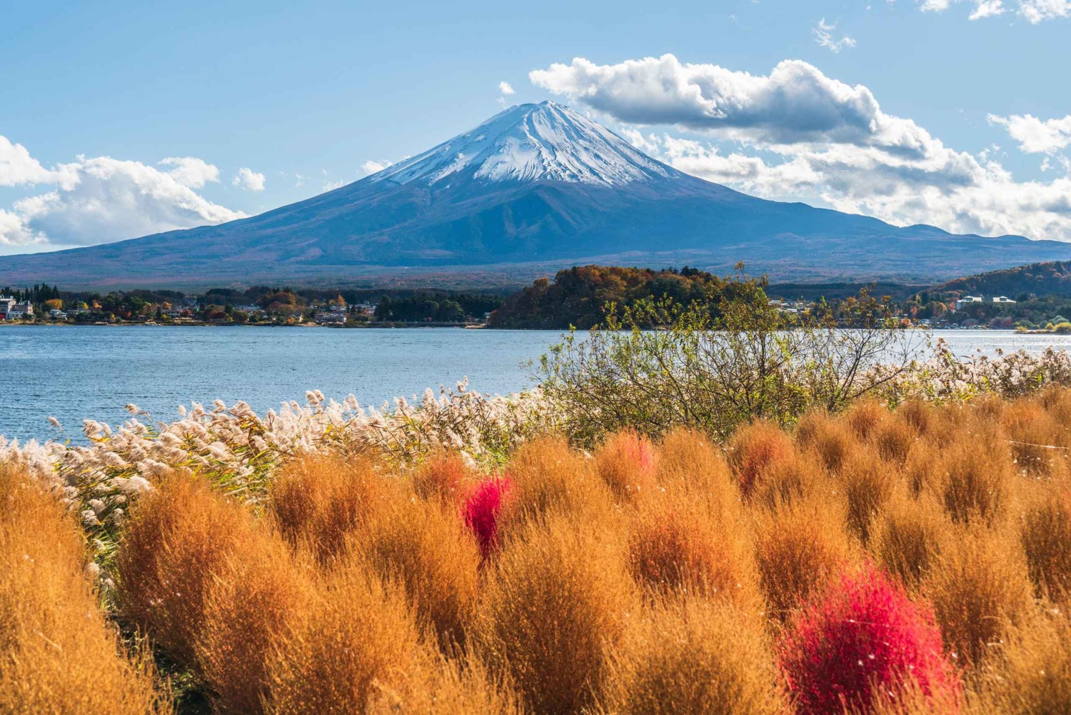 Syksy: Järvenrannan ruoho muuttuu kultaiseksi, ja Fuji-vuoren ensimmäinen lumi näkyy hämärästi kaukana.