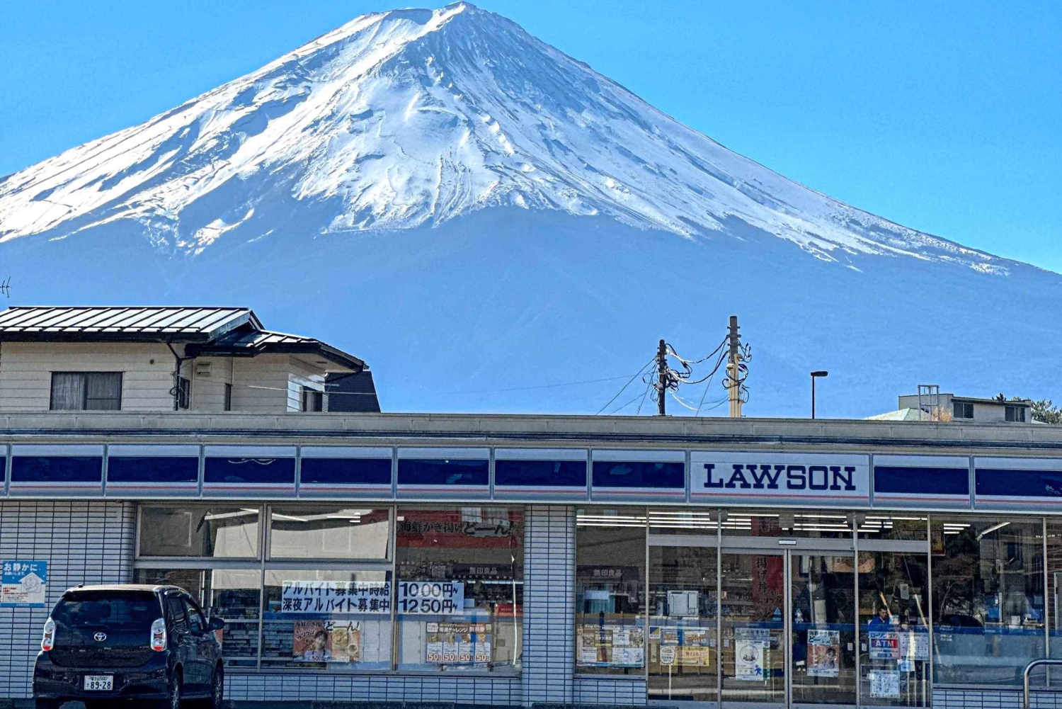 Inizia il tuo viaggio la mattina presto da Tokyo o Shinjuku e dirigiti direttamente nel cuore delle meraviglie che circondano il Monte Fuji. La tua prima tappa è il Lawson Fujikawaguchiko Town Hall, dove farai una breve pausa e potrai ammirare per la prima volta il Monte Fuji che si erge imponente in lontananza.
