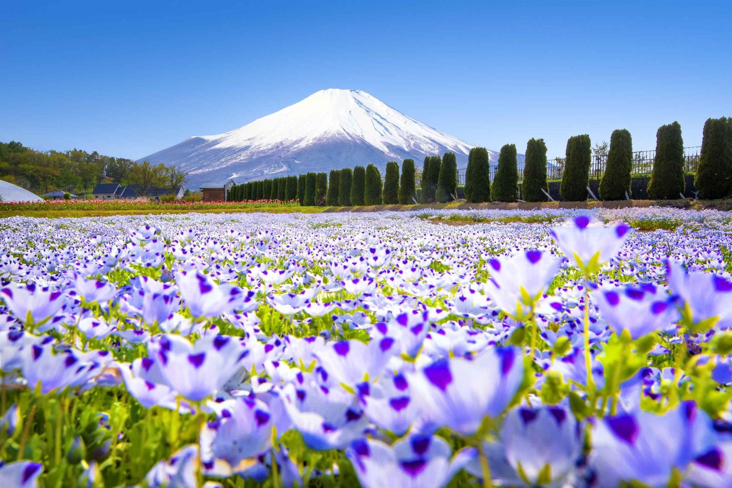 Dopo, visita il parco Yamanakako Hana no Miyako, un vasto parco fiorito sullo sfondo maestoso del Monte Fuji. A seconda della stagione, troverai campi di tulipani, girasoli o cosmos in piena fioritura, perfetti per ricordi di viaggio vivaci.