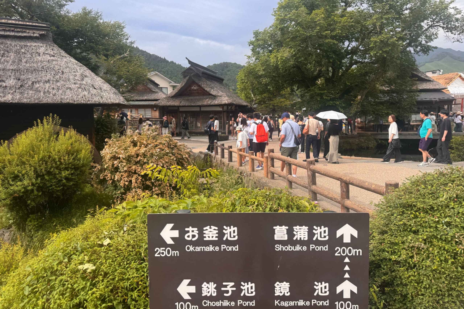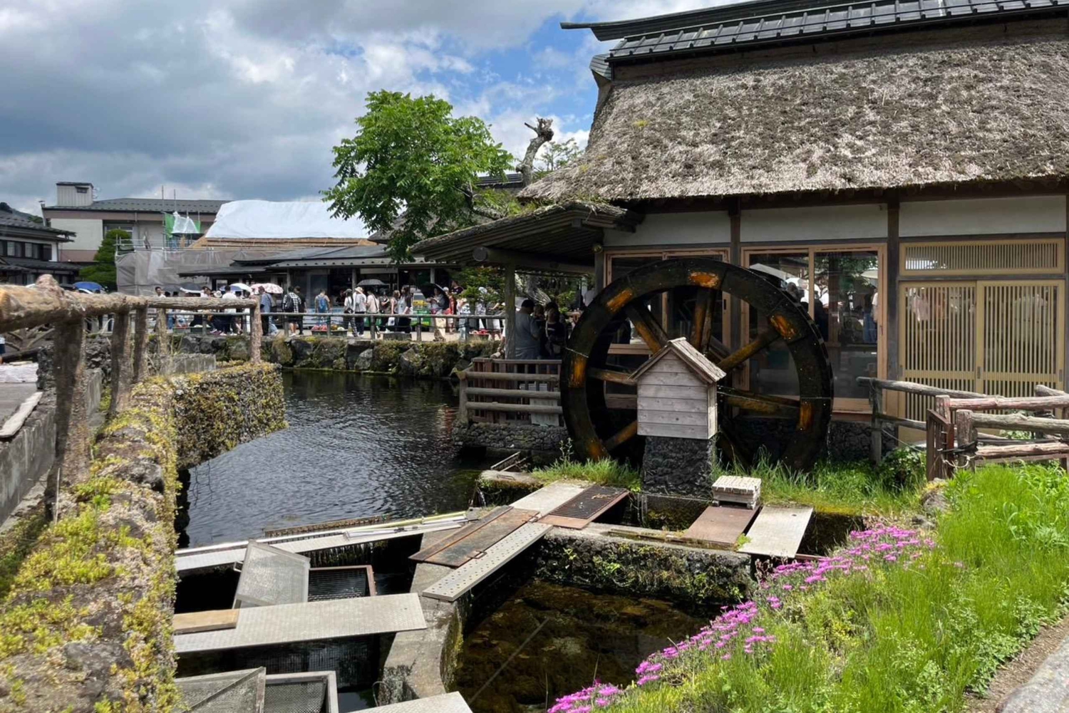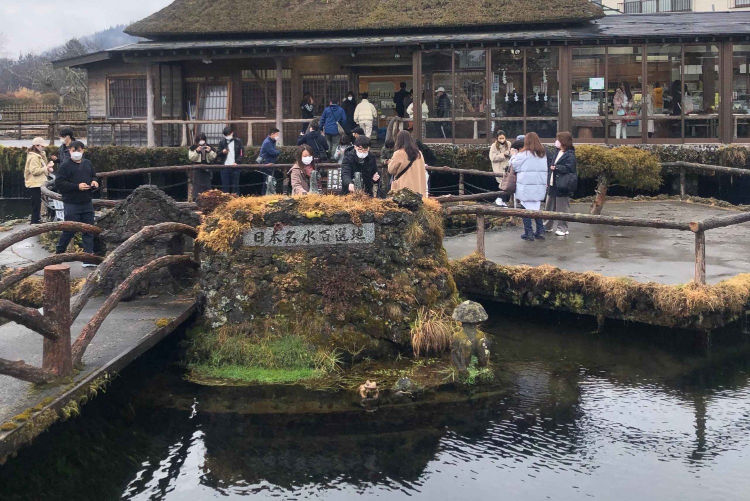 最終目的地は、火山噴火によって形成された8つの水晶のように澄んだ聖なる泉の池で知られる、絵のように美しい村「忍野八海」です。ミネラル豊富な泉と伝統的な家屋に囲まれた風景は、まさに童話の世界そのものです。