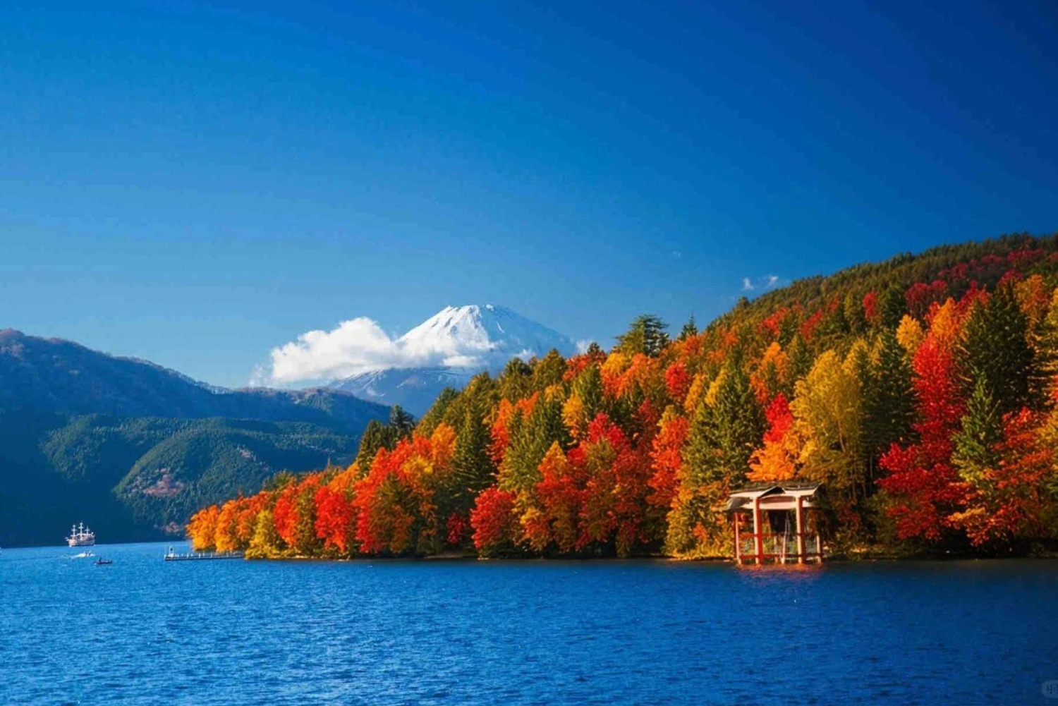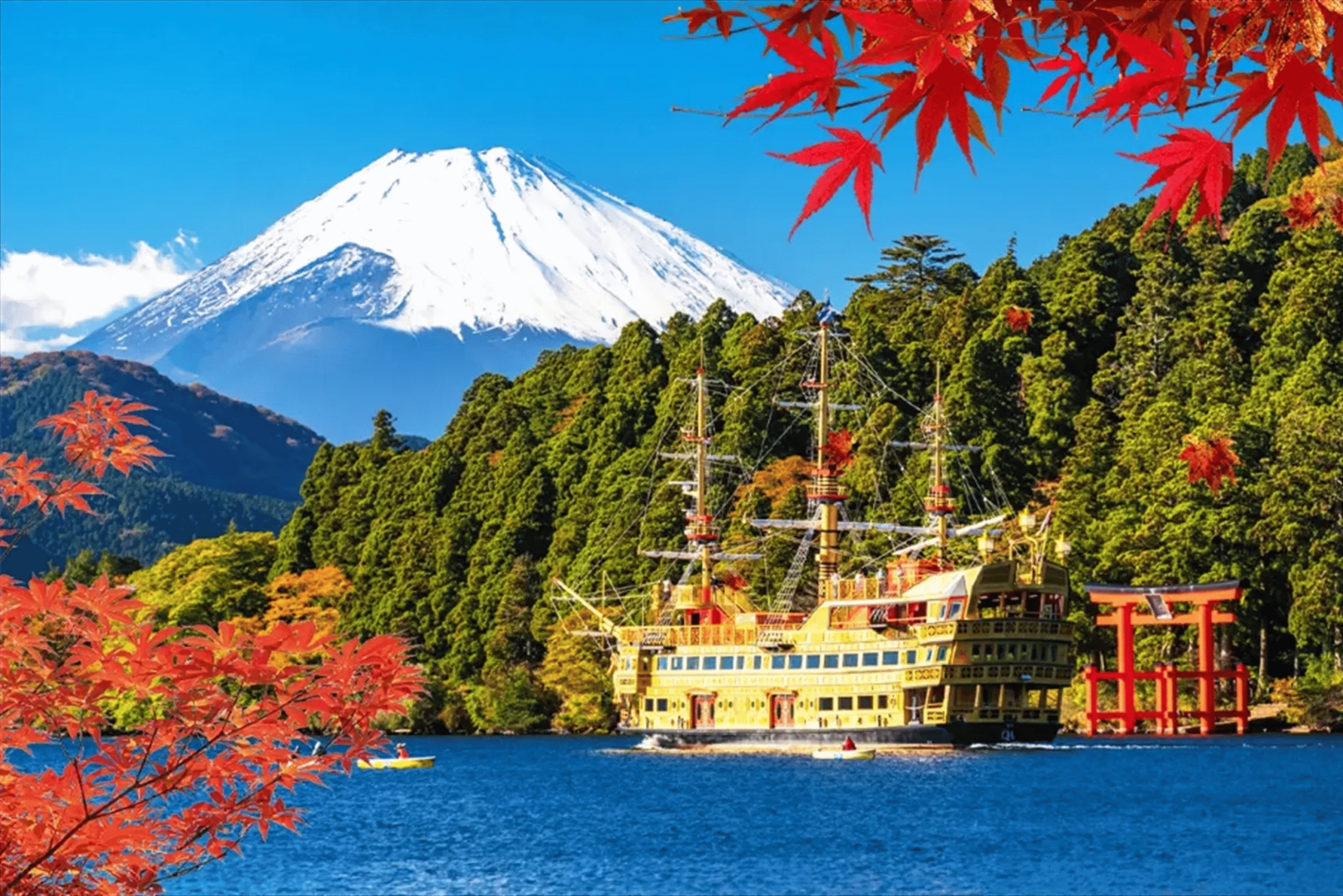 富士山と箱根を巡る1日ツアーをご体験ください。箱根神社を訪れ、無料の箱根海賊船に乗り、無料の箱根ロープウェイに乗り、大涌谷と山中湖のスワンビーチを探索しましょう。(11月30日までの旅行は無料です)
