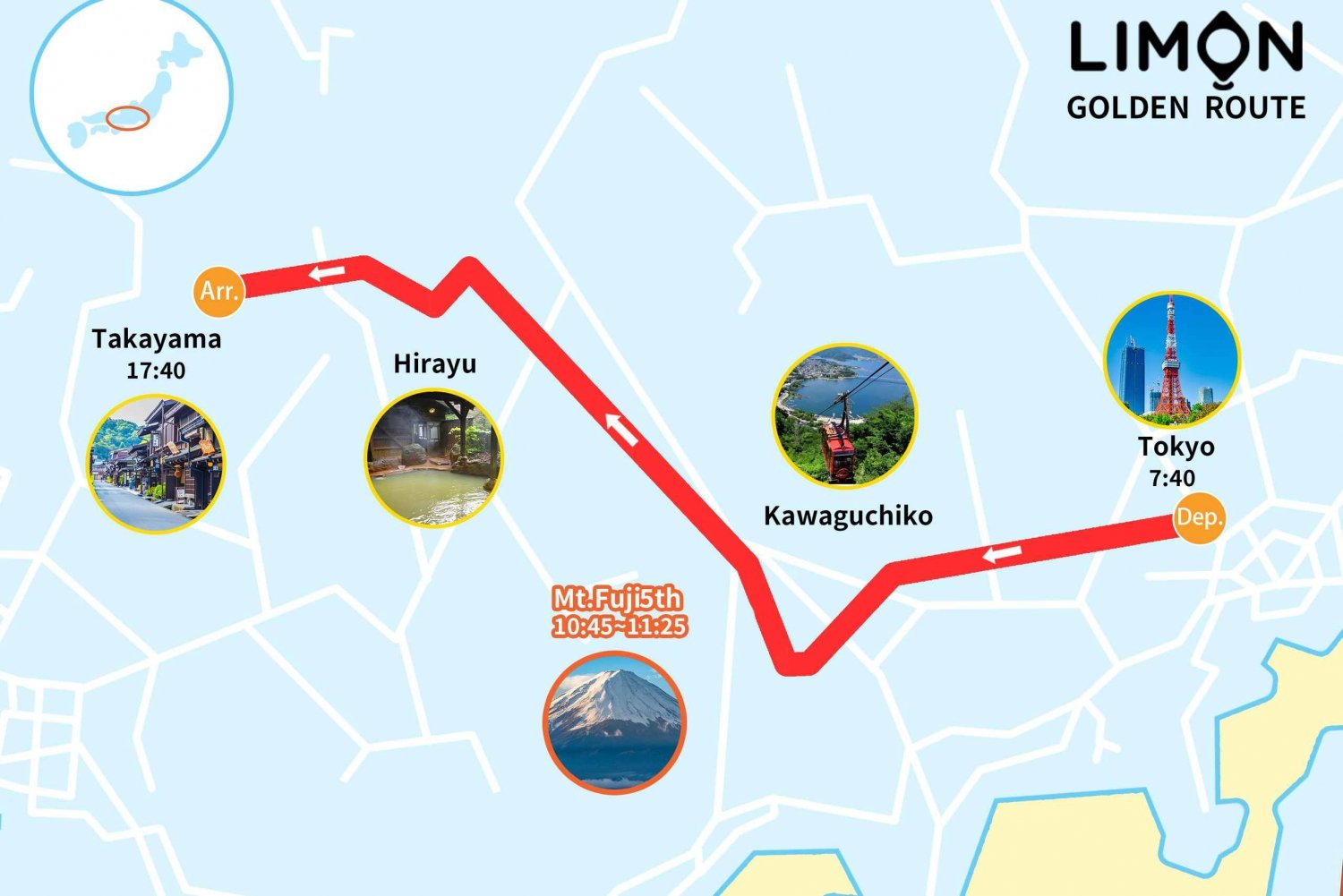 De route loopt door Kawaguchiko, met een prachtig uitzicht op het Kawaguchimeer en de berg Fuji, en door Hirayu Onsen, een charmant dorpje in de Japanse Alpen dat bekend staat om zijn warmwaterbronnen en serene berglandschap.