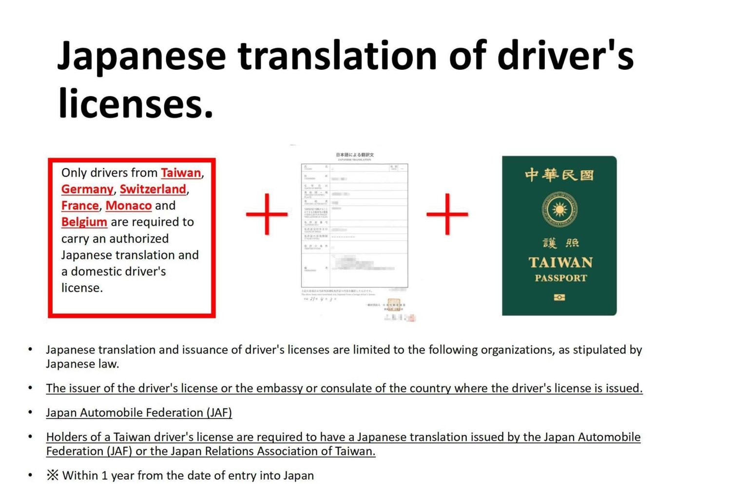 ALLE deelnemers hebben een internationaal rijbewijs nodig, afgegeven in het formaat van de Conventie van Genève van 1949, van een door de overheid erkende organisatie om in Japan te mogen rijden. - BEHALVE deelnemers met rijbewijzen uit Zwitserland, Duitsland, Frankrijk, Taiwan, België of Monaco moeten een Japanse vertaling van hun rijbewijs aanvragen bij de Japan Automobile Federation (JAF).