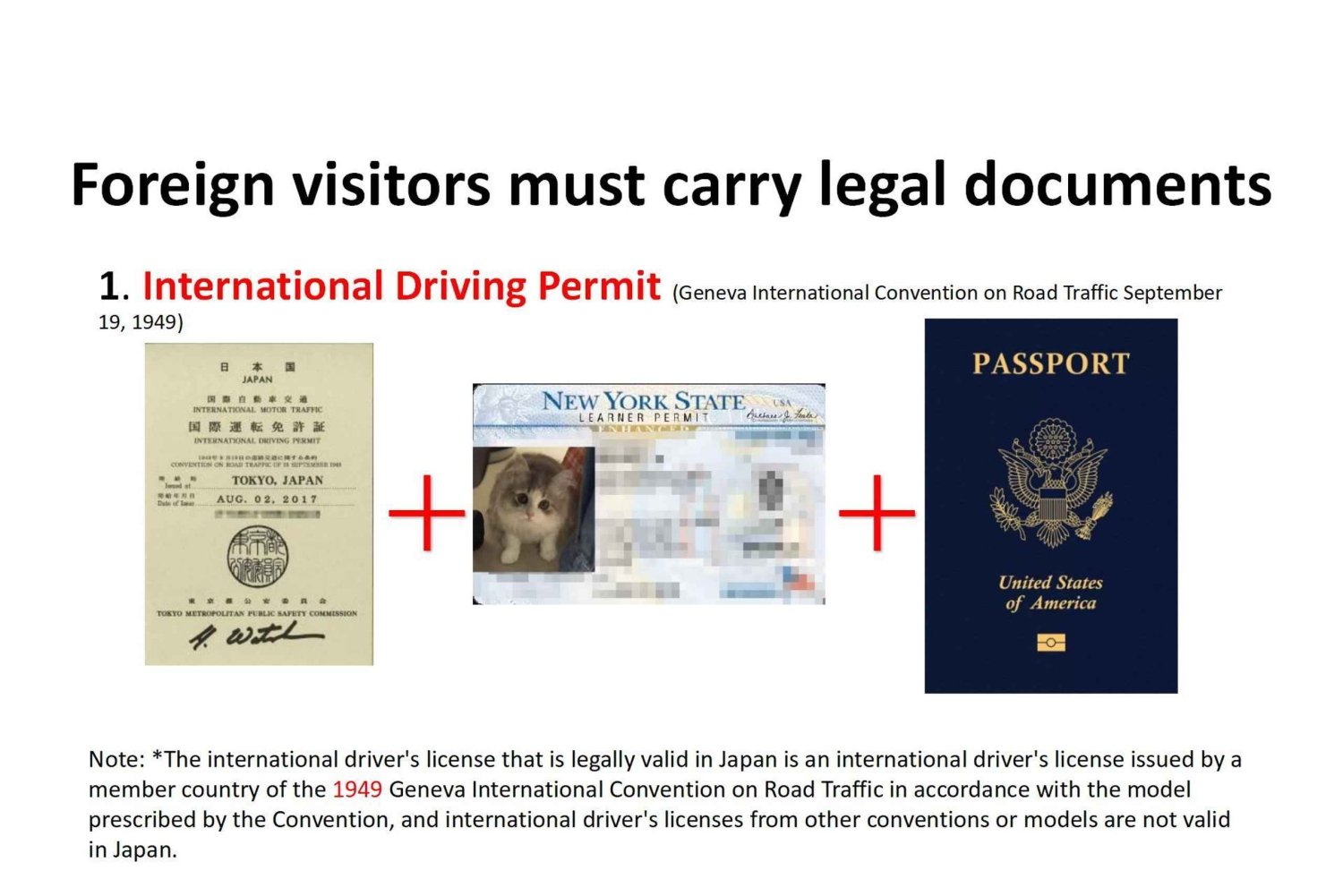 Rijbewijzen van landen die niet onder de Conventie van Genève van 1949 vallen (zoals China, Indonesië, Mexico, Qatar, Saoedi-Arabië, etc.) zijn niet toegestaan om in Japan te rijden.