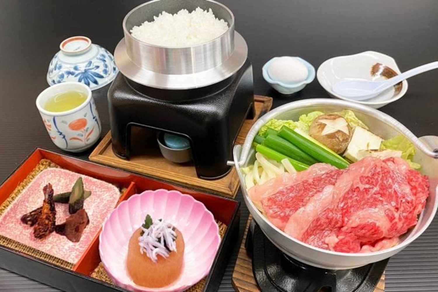 - Delektuj się pysznym posiłkiem Sukiyaki Gozen z wysokiej jakości ryżem Gin Shari Kamahan.