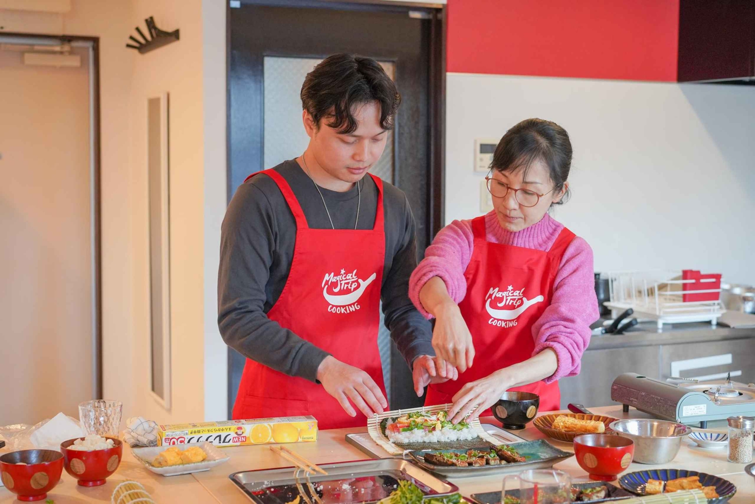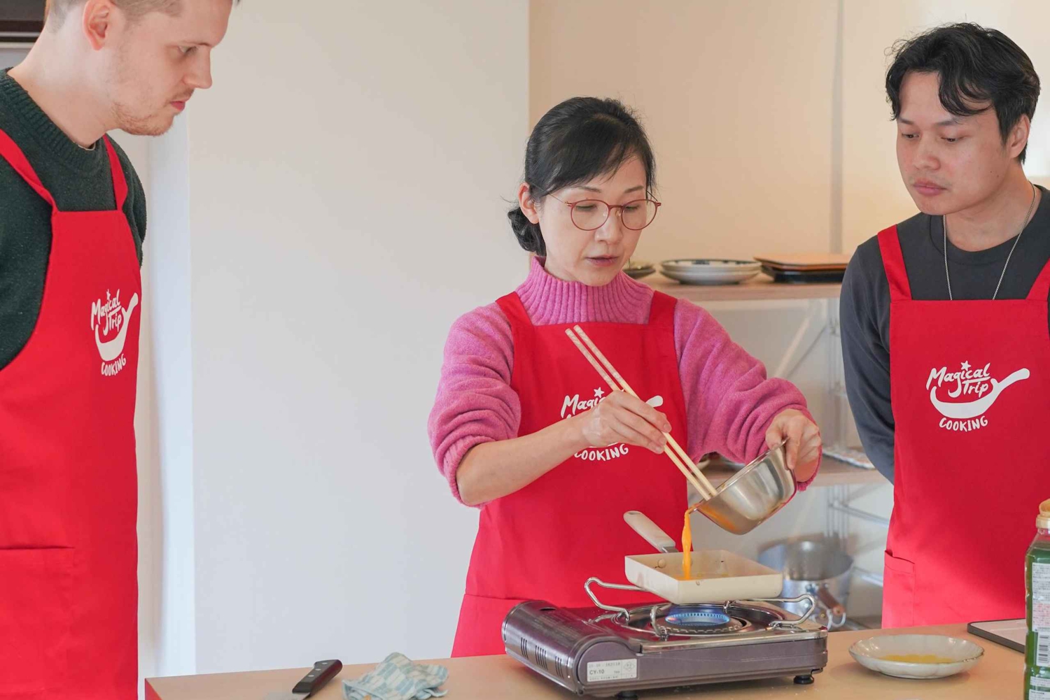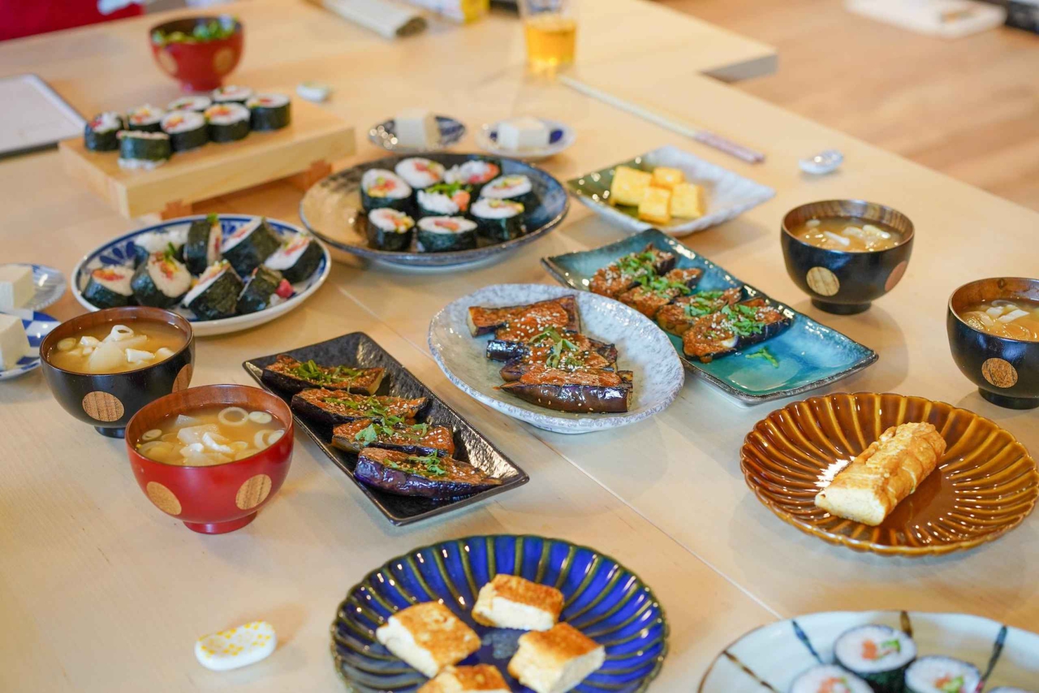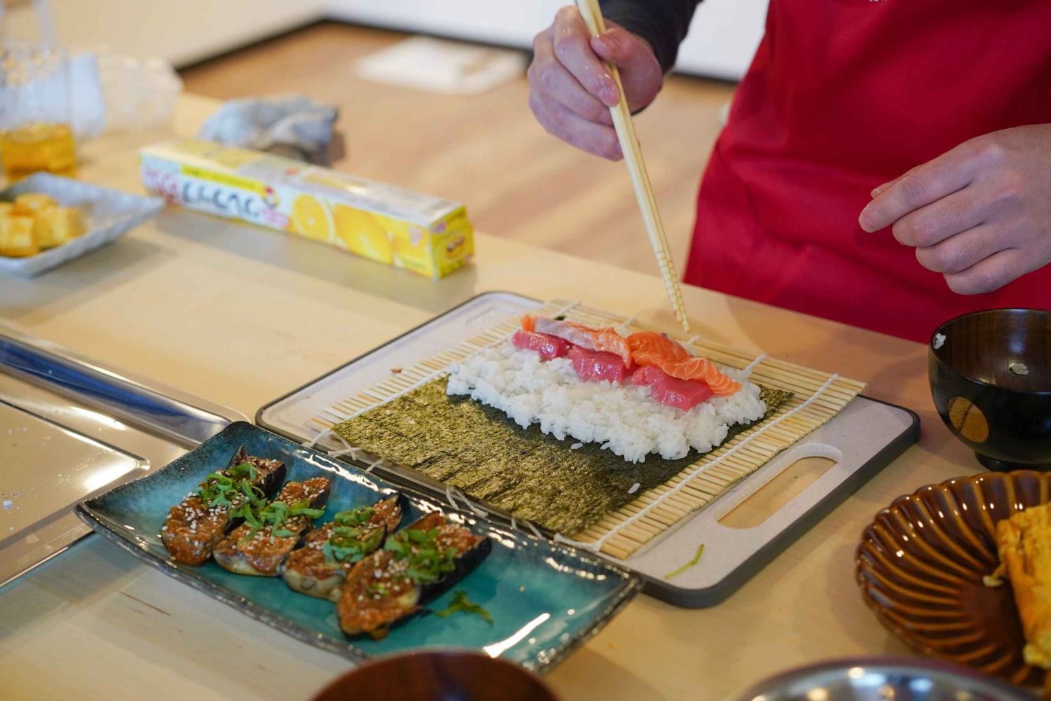 Собрав ингредиенты, мы перейдем в профессиональную кухонную студию, чтобы приступить к приготовлению пищи. Под руководством инструктора вы овладеете приемами японской домашней кухни: от точного владения японским ножом до приготовления основных элементов, таких как даси для супа мисо, и приготовления риса для суши, приправленного уксусом. Помимо суши, вы погрузитесь в создание аутентичных блюд, таких как суп мисо, дэнгаку из баклажанов и восхитительный дашимаки тамаго (рулет из яиц).