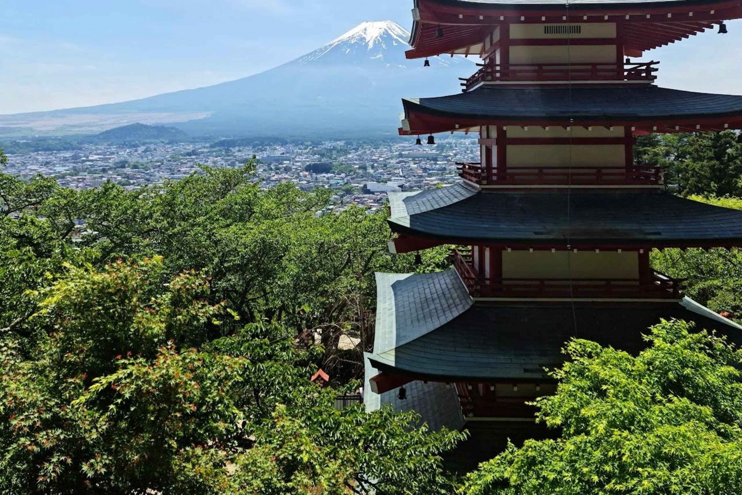 Оставьте оживленный город позади и направляйтесь к самому знаковому природному чуду Японии. Ваш первый пункт назначения — пагода Тюрейто, поразительное пятиэтажное сооружение, расположенное на склоне холма, откуда открывается один из самых живописных видов в стране. Здесь гора Фудзи величественно возвышается на заднем плане, идеально обрамленная пагодой и, в зависимости от сезона, нежно-розовыми цветами сакуры или огненными оттенками осенних листьев.