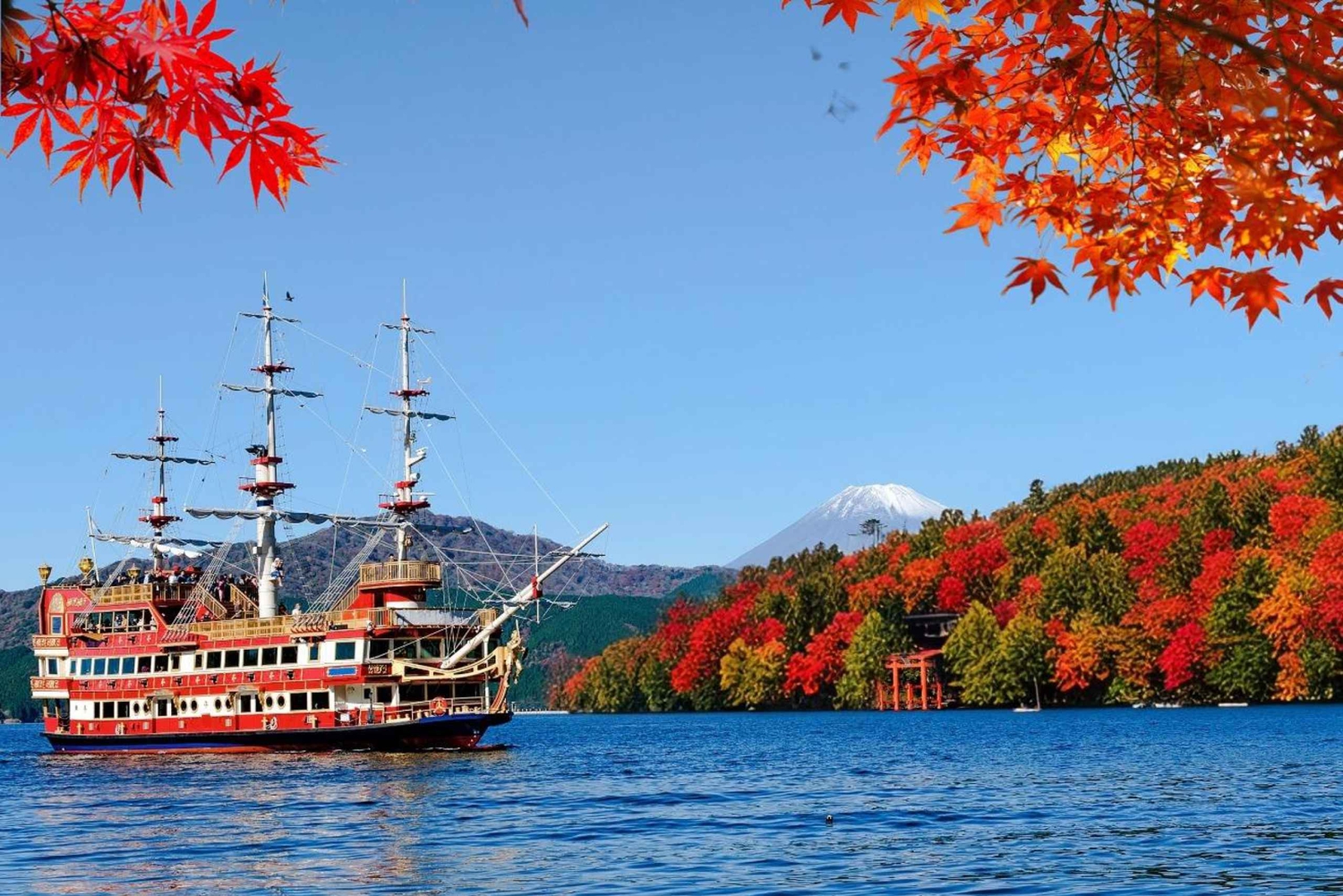 Gå ombord på piratskeppet i retrostil och andas in den friska sjöbrisen när du går ut på det öppna däcket. Innan du får en hisnande utsikt: det djupblå vattnet i Ashi-sjön, det majestätiska berget. Fuji i fjärran, och den ikoniska röda torii-porten till Hakone-helgedomen.