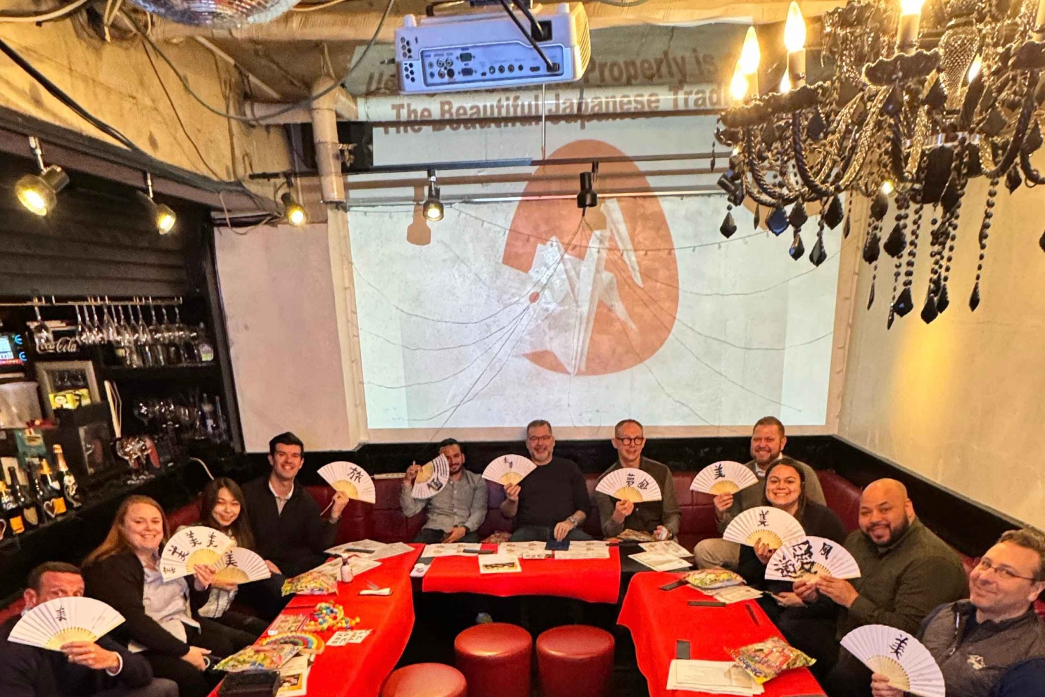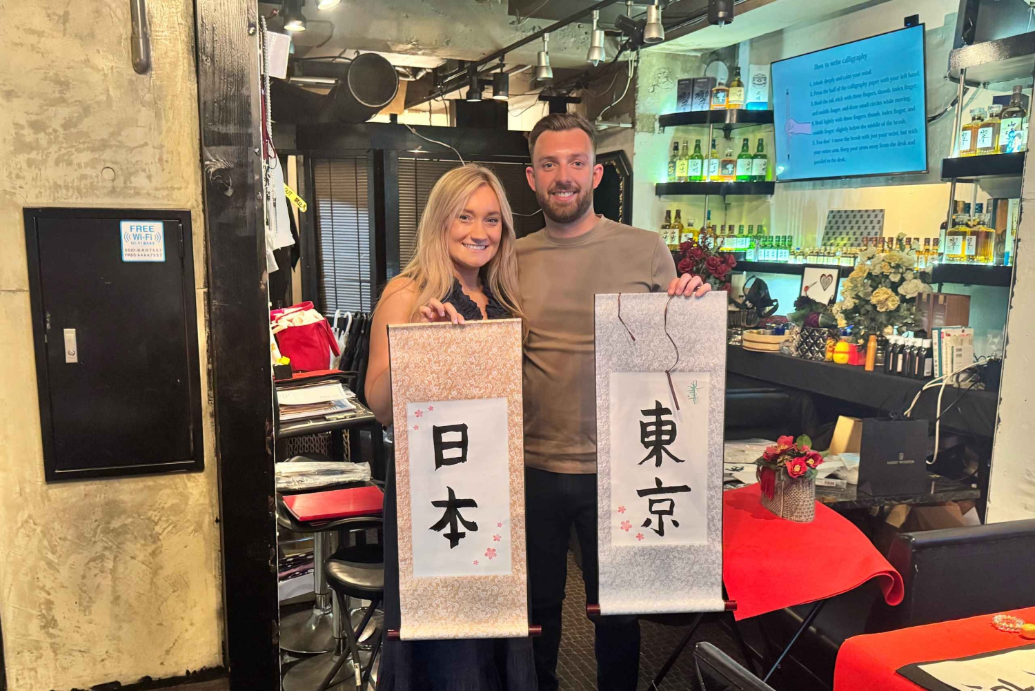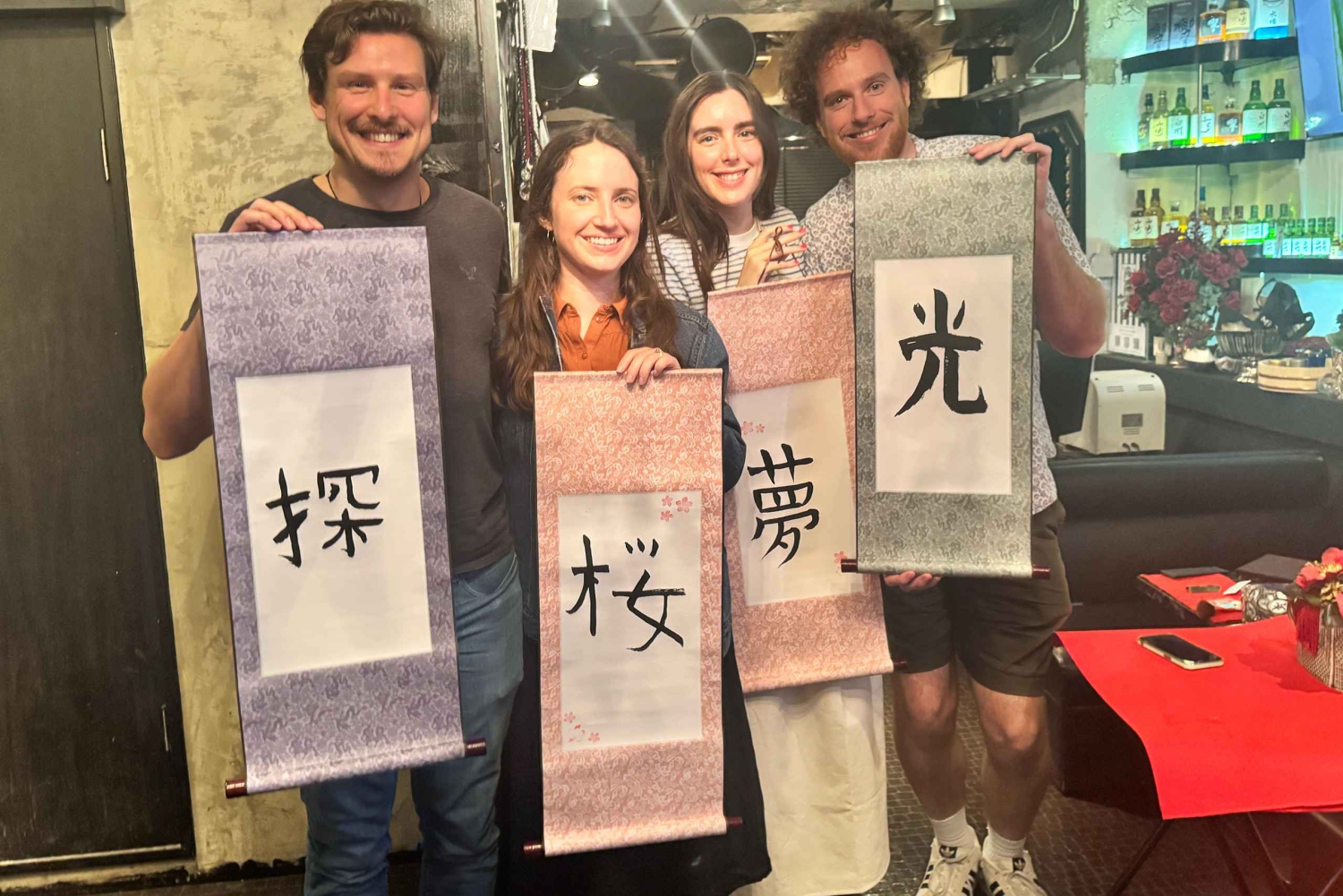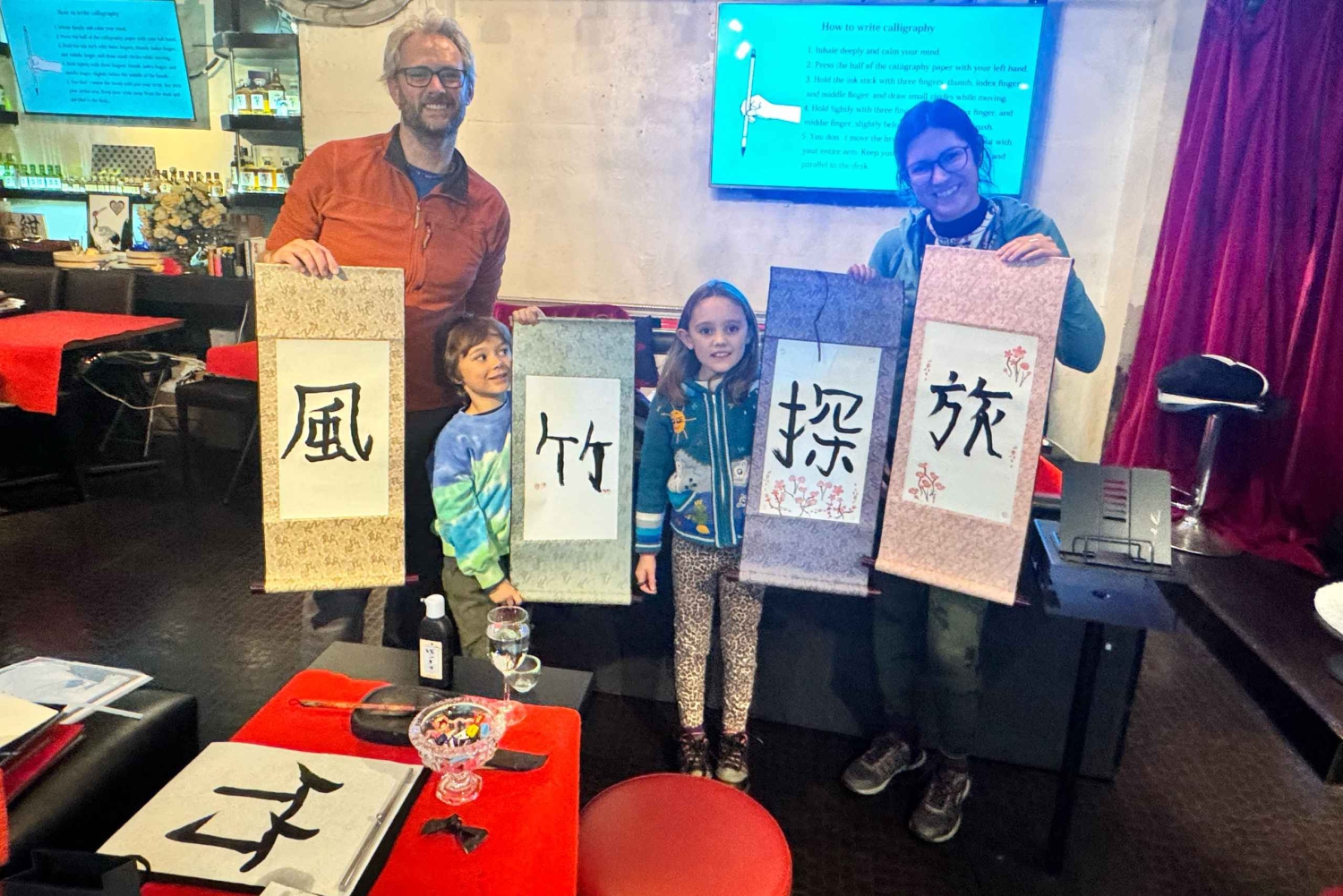 Tokyo: Kalligrafi på kanji-fläkt och rulle med dryck