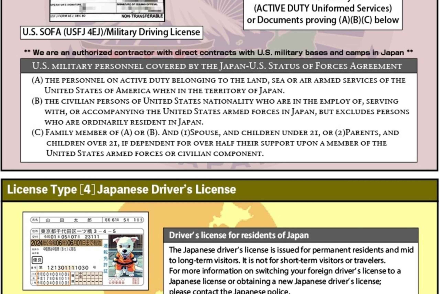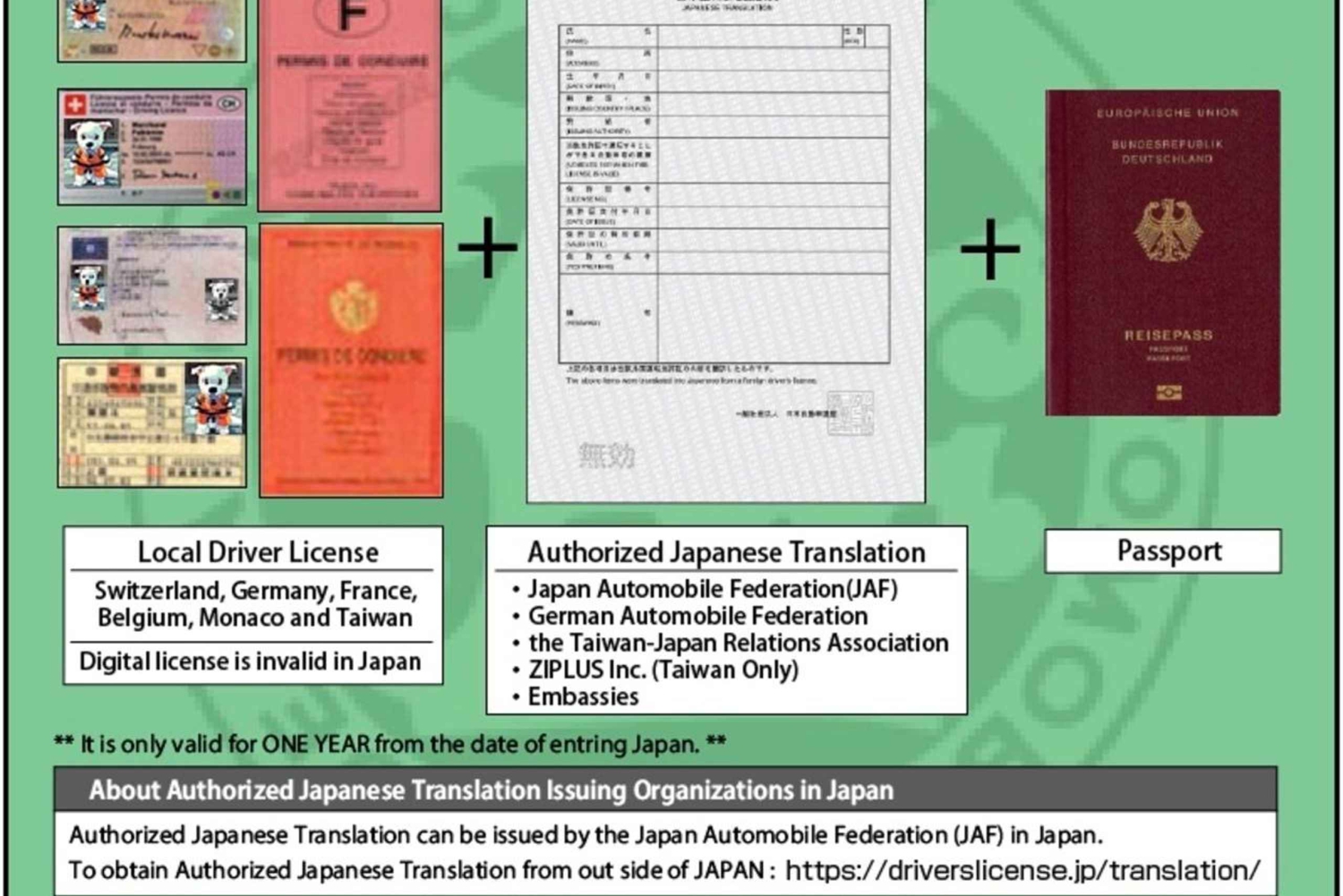 - Körkort utfärdade i Schweiz, Tyskland, Frankrike, Taiwan, Belgien eller Monaco måste skaffa en japansk översättning av sitt körkort från Japan Automobile Federation (JAF), INTE ett internationellt körkort.