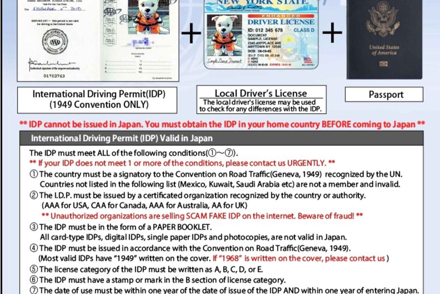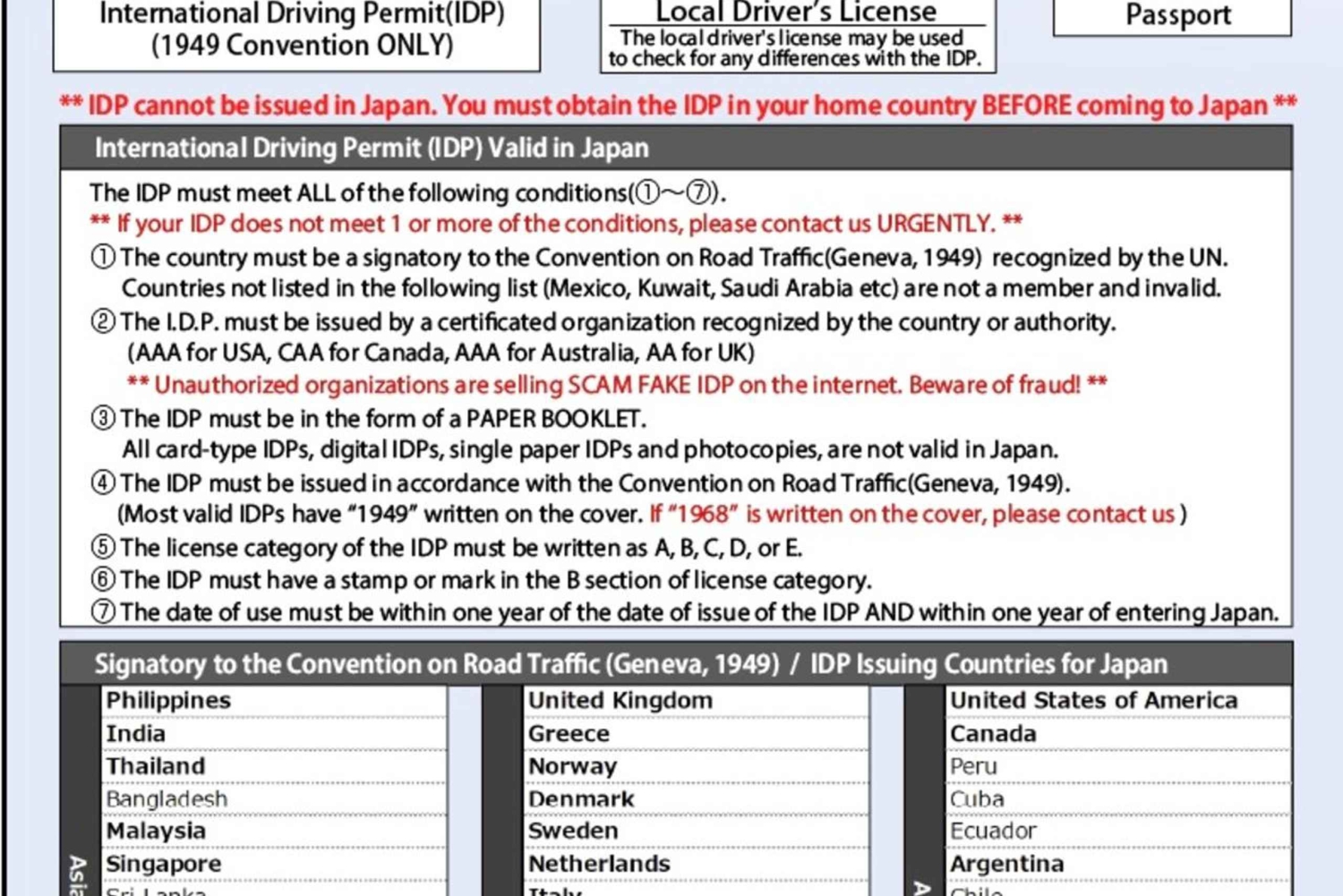 - Deltagarna måste bära med sig sitt fysiska internationella körkort (eller för undantagsländer som anges ovan och som kräver en japansk översättning: det fysiska inhemska körkortet + officiell översättning) och sitt fysiska pass.