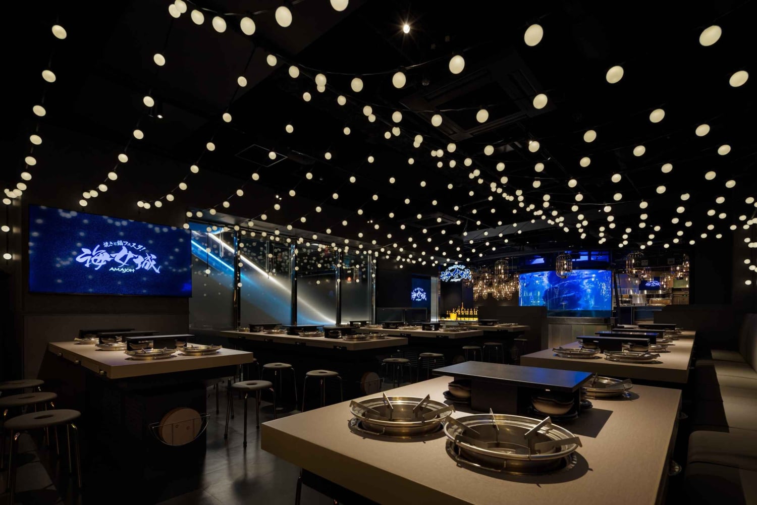 The interior is illuminated by the blue of the aquarium and warm-colored lights, creating a magical atmosphere. The restaurant offers a one-person hotpot experience, featuring fresh seafood and premium black wagyu, prepared to your liking — whether grilled or in a hotpot. Customize your hotpot dishes by selecting your preferred ingredients and broth, with options including wagyu yakiniku, grilled seafood, shabu-shabu, sukiyaki, and seafood hotpot.